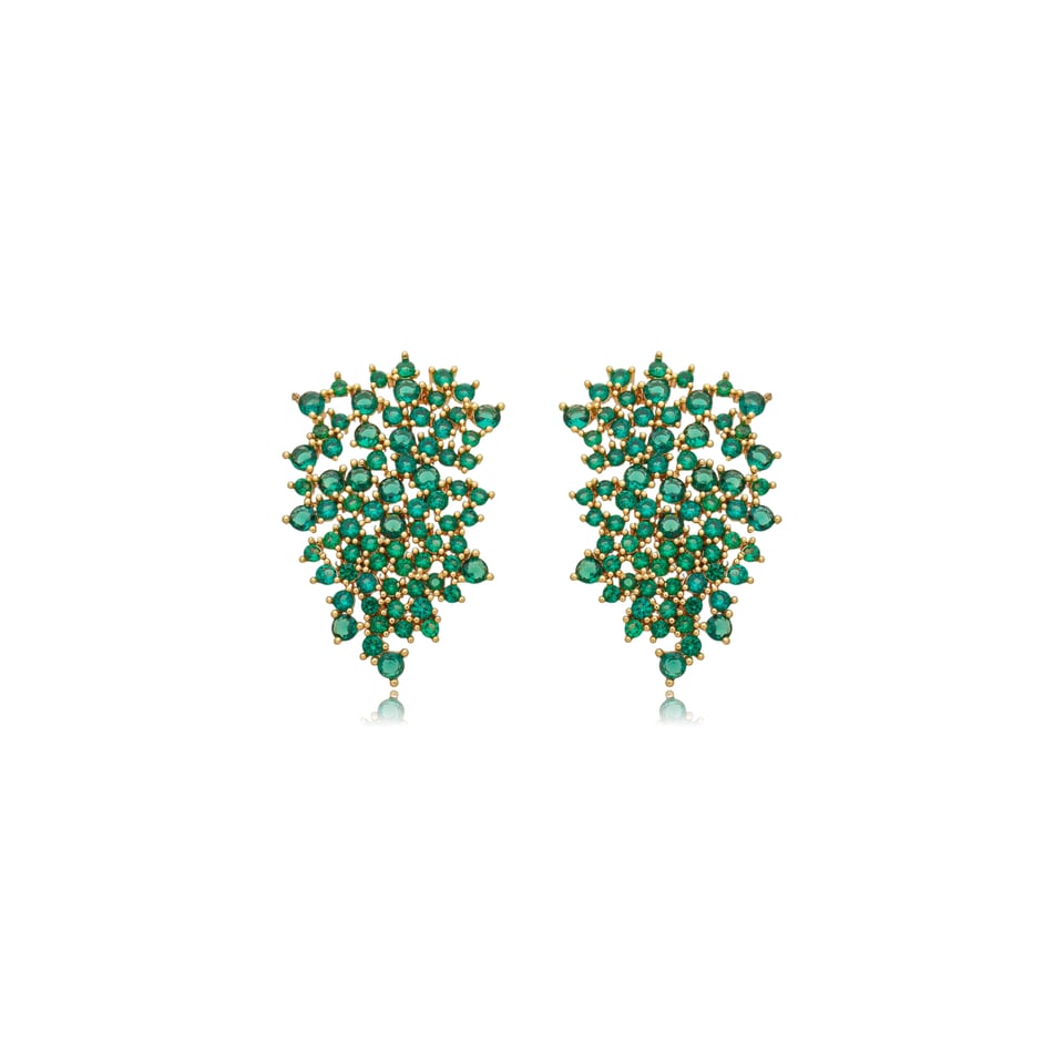 Brinco banho de ouro com zircônias cravejadas na cor verde esmeralda.