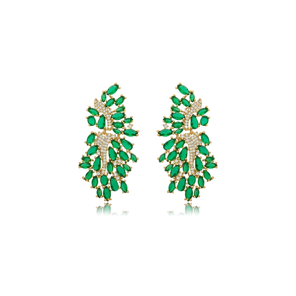 Brinco banho de ouro com micro zircônias cravejadas na cor branco (cristal) e zircônias na cor verde esmeralda.