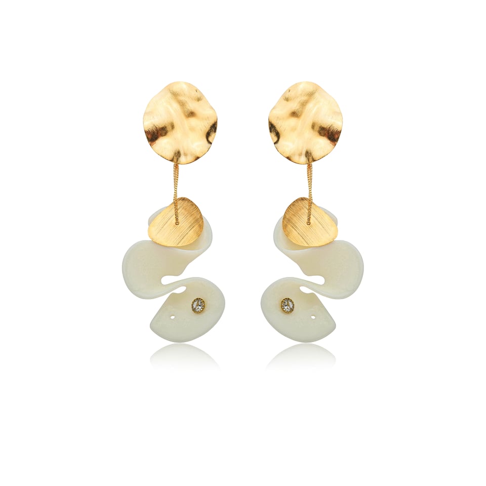 Inspirado nas formas orgânicas da natureza, o Brinco Palone Design Ondas Resina combina metal martelado em ouro vintage com aplicações em resina e cristais sutis. Uma peça escultural e elegante, que ilumina o rosto com arte e sofisticação.