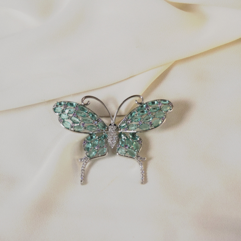 Broche banho prateado com design de borboleta, uma peça delicada e sofisticada que simboliza leveza e transformação. Possui aplicação de cristais na cor verde água, que trazem frescor e suavidade, combinados com micro zircônias cravejadas na cor branco cristal, garantindo brilho elegante.