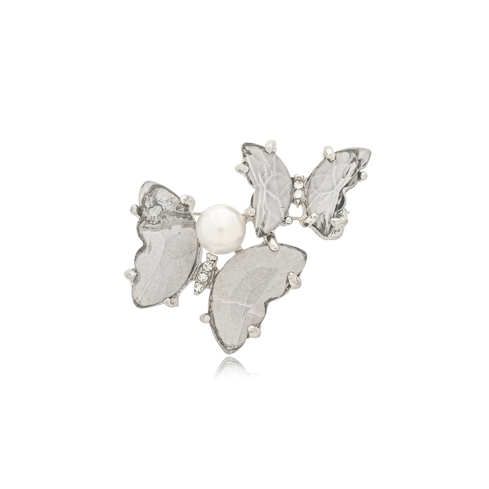 Broche banho prateado com design de borboletas com aplicação de cristais de vidro na cor cinza e pérola.