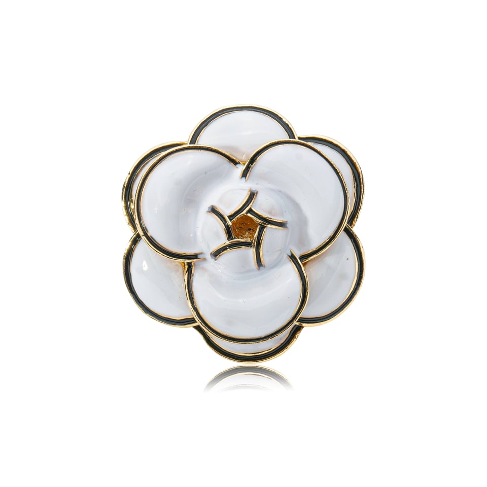 Broche camélia esmaltada na cor branca, com bordas pretas e acabamento em banho dourado. A peça traz um design clássico e sofisticado, com contraste elegante entre o esmalte branco e os contornos pretos, valorizados pelo brilho do dourado. Ideal para quem busca um acessório refinado e atemporal, perfeito para complementar blazers, vestidos, camisas, bolsas ou lenços, adicionando charme e personalidade ao look.