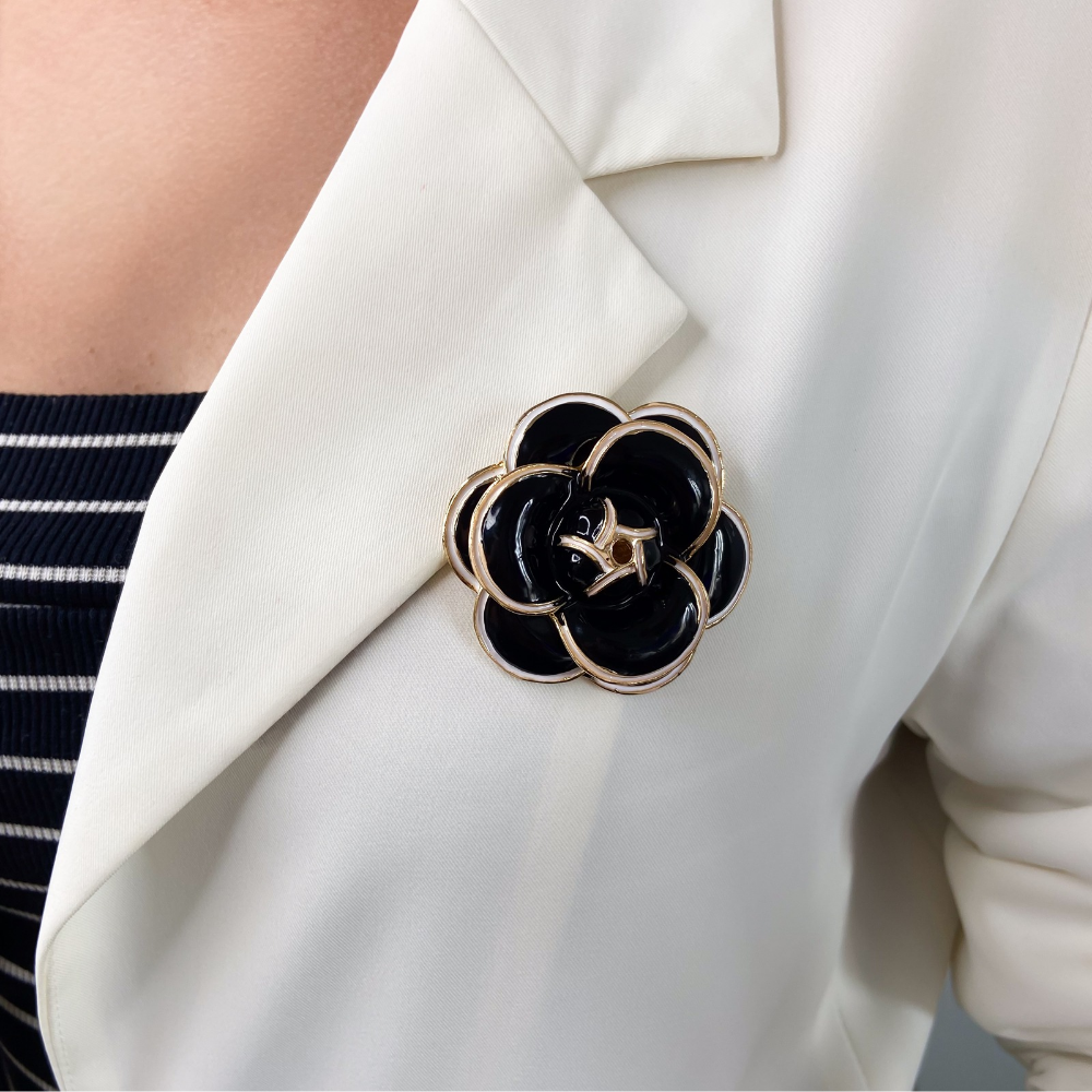 Broche camélia esmaltada na cor preta, com bordas brancas e acabamento em banho dourado. A peça traz um design clássico e sofisticado, com contraste elegante entre o esmalte preto e os contornos brancos, valorizados pelo brilho do dourado. Ideal para quem busca um acessório refinado e atemporal, perfeito para complementar blazers, vestidos, camisas, bolsas ou lenços, adicionando charme e personalidade ao look.