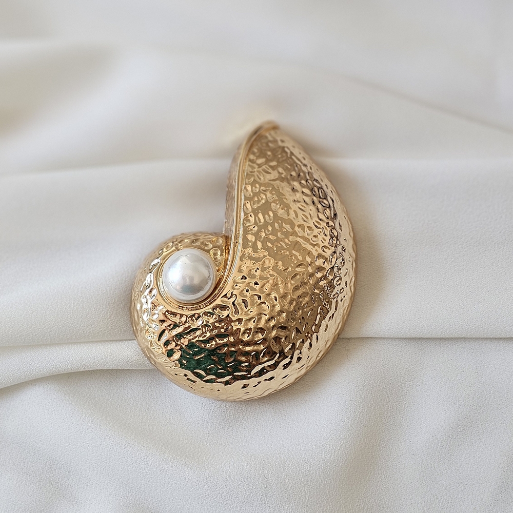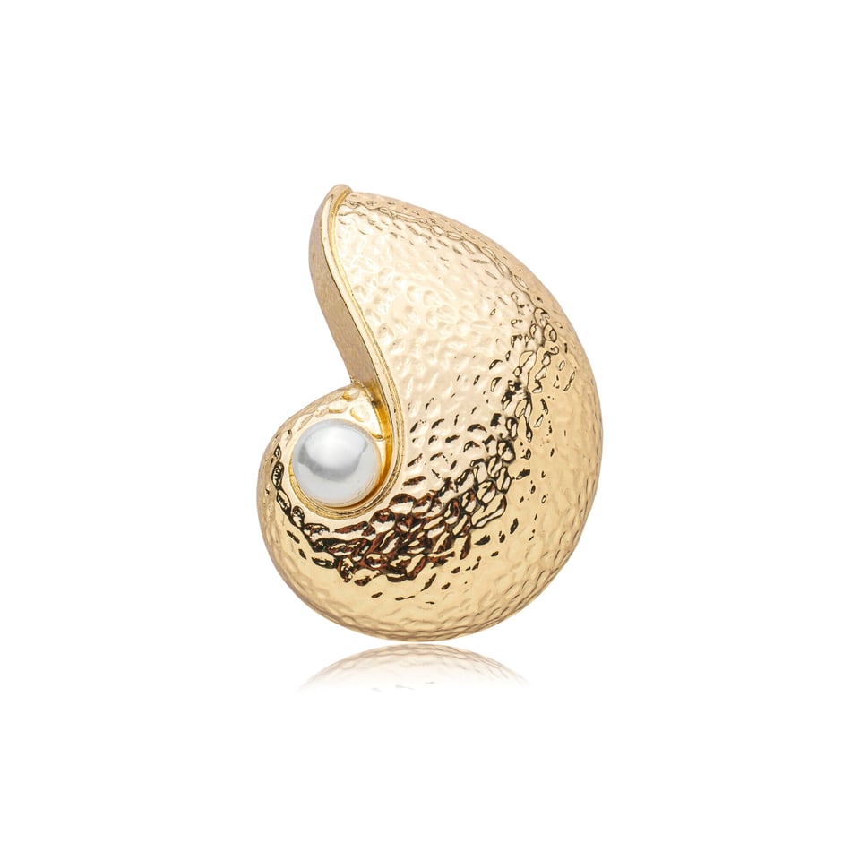 Broche no banho de ouro e design orgânico de formas curvas, com acabamento texturizado e aplicação de pérola sintética central. Um acessório sofisticado e atemporal, ideal para valorizar blazers, vestidos, camisas e produções elegantes com um toque contemporâneo e feminino.