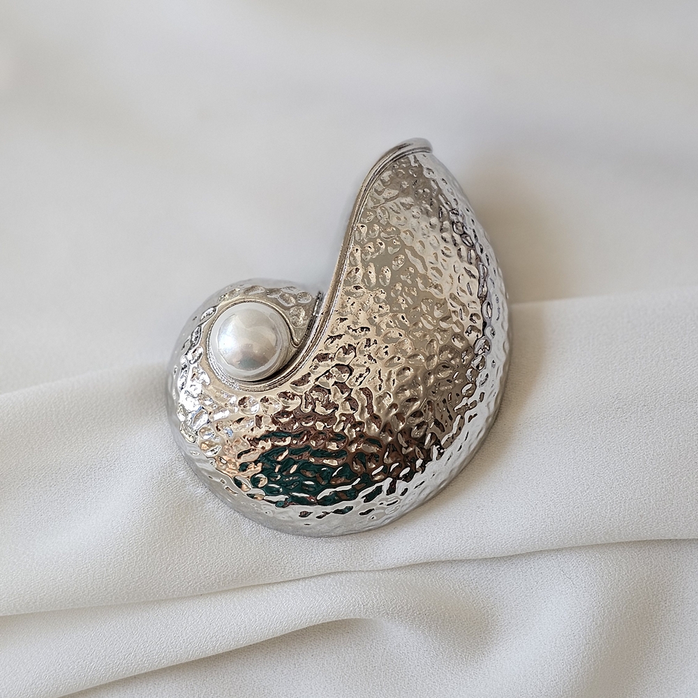 Broche no banho de ródio e design orgânico de formas curvas, com acabamento texturizado e aplicação de pérola sintética central. Um acessório sofisticado e atemporal, ideal para valorizar blazers, vestidos, camisas e produções elegantes com um toque contemporâneo e feminino.