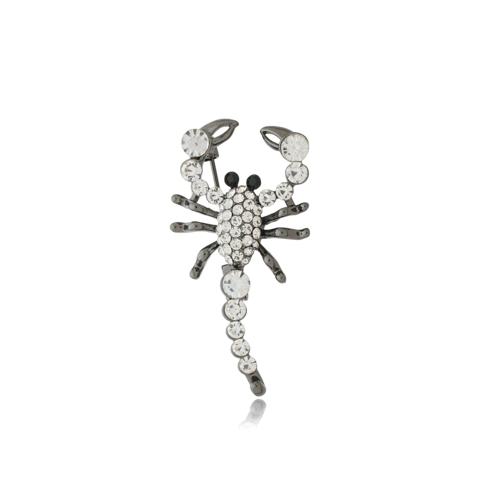 Broche banho de ródio negro no formato de escorpião com aplicação de cristais na cor branco (cristal).