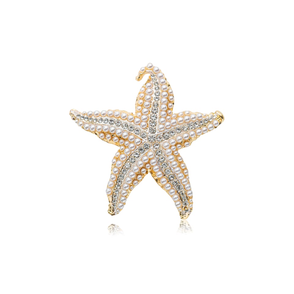 Broche estrela do mar com banho dourado, design delicado e aplicação de pérolinhas e strass na cor branca (cristal). A peça apresenta acabamento sofisticado e inspiração no universo marítimo, unindo o brilho suave das pérolas ao brilho sutil do strass. Ideal para quem busca um acessório elegante e atemporal, perfeito para valorizar blazers, vestidos, camisas, bolsas ou lenços, adicionando charme e leveza ao look.