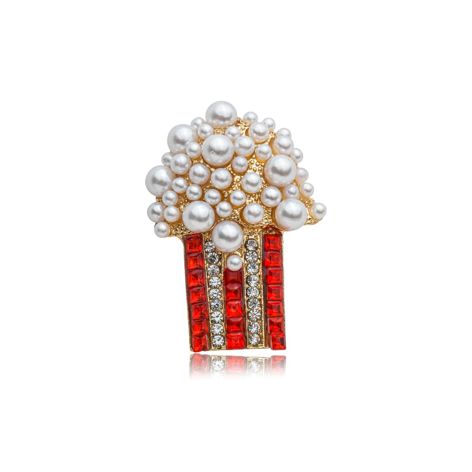 Broche Pipoca Pérolas com banho de ouro, design criativo em formato de balde de pipoca, com aplicação de pérolas e cristais nas cores branco (cristal) e vermelho. Um acessório divertido e sofisticado, ideal para dar destaque a looks modernos e cheios de personalidade.