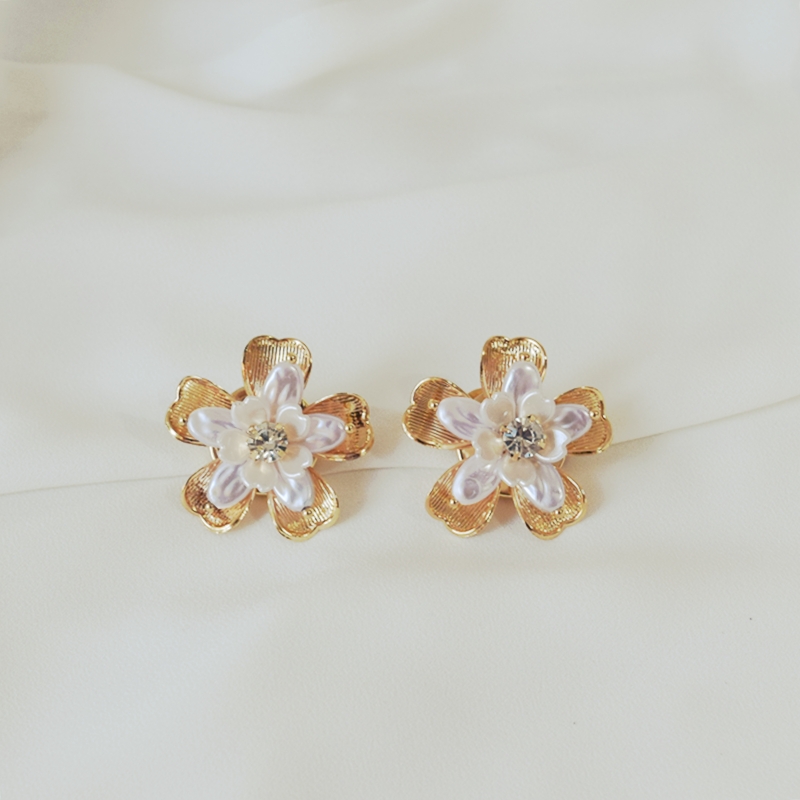 O acabamento dourado com textura nas pétalas externas valoriza ainda mais o design, criando um contraste elegante entre o metal e o brilho acetinado da madrepérola.