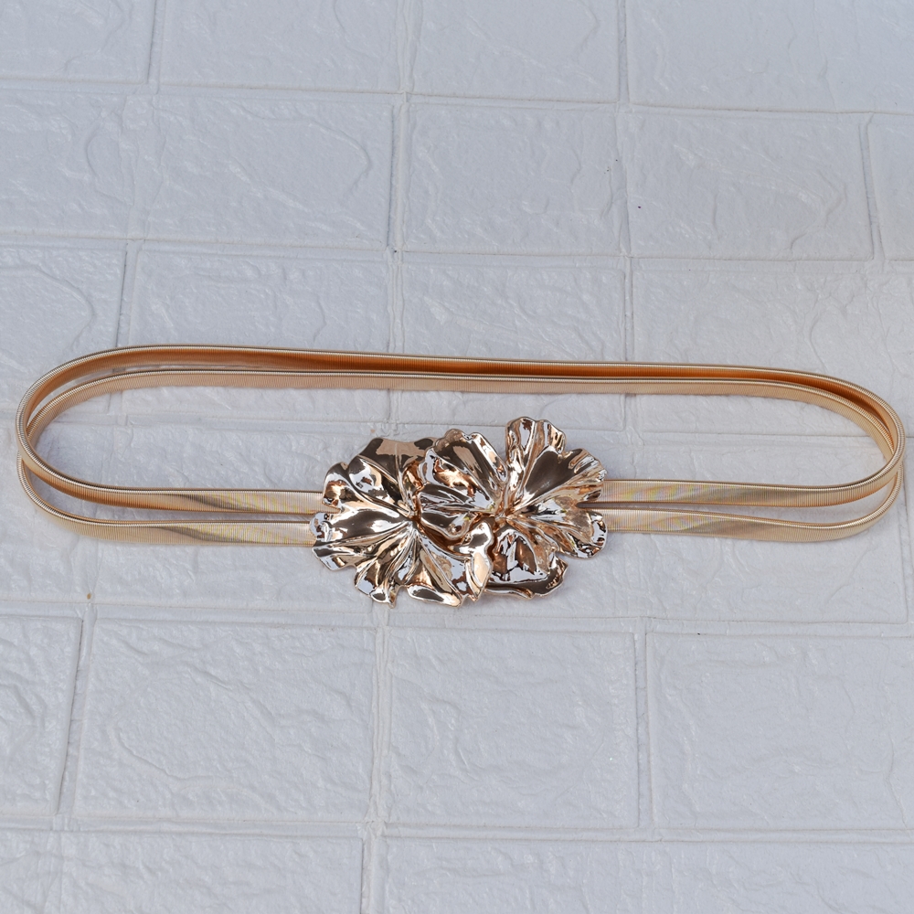 Cinto de corrente dupla em malha com banho dourado e fivela em formato de flor, que adiciona um toque feminino e elegante ao visual. Ajustável e confortável, sua malha elástica se adapta perfeitamente à silhueta.