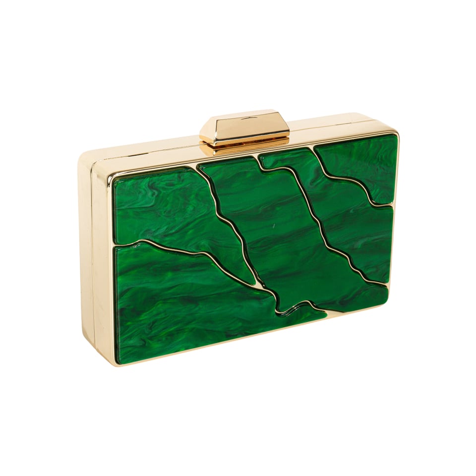 Clutch retangular de acrílico imitando madrepérola na cor verde com detalhes no metal dourado.