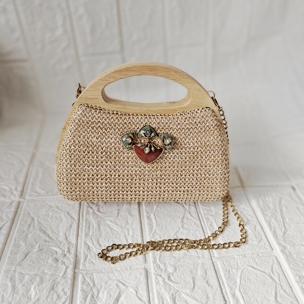 Clutch de palha Camila Klein com pedra natural jaspe vermelha e metais em banho de ouro velho. O modelo apresenta alça de corrente e alça de mão em madeira, unindo charme artesanal e design sofisticado. O forro interno em tecido preto garante acabamento impecável e proteção aos itens pessoais. Uma peça versátil e elegante, perfeita para elevar produções do dia a dia ou ocasiões especiais com um toque autoral.