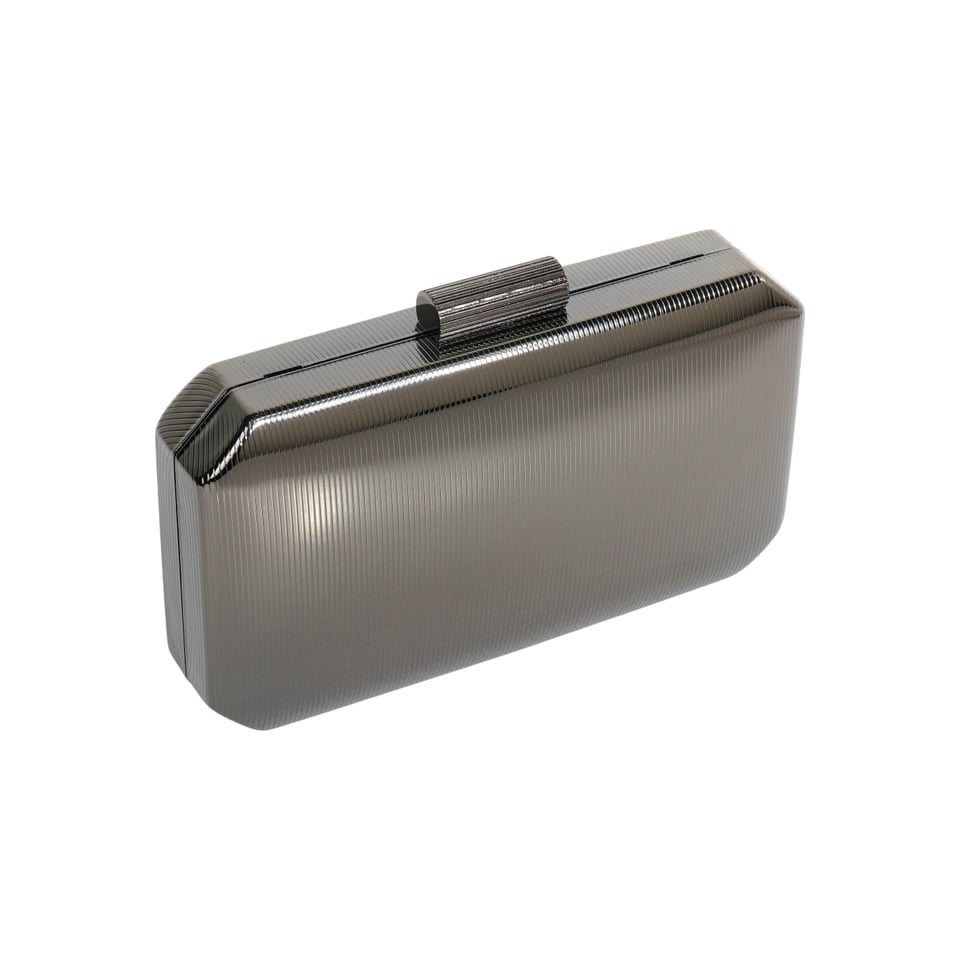 Clutch retangular metal na cor grafite trabalhada em listras finas.
