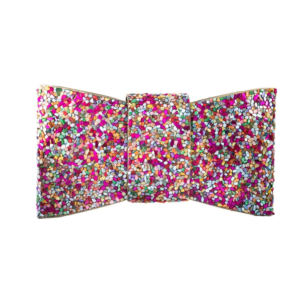 Clutch em formato de laço com aplicação de cascalhos coloridos que refletem a luz com elegância.