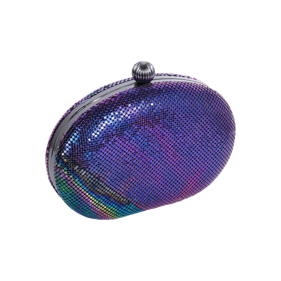 Clutch oval na cor furta-cor com variações entre azul, roxo e verde no tecido malha metálico.