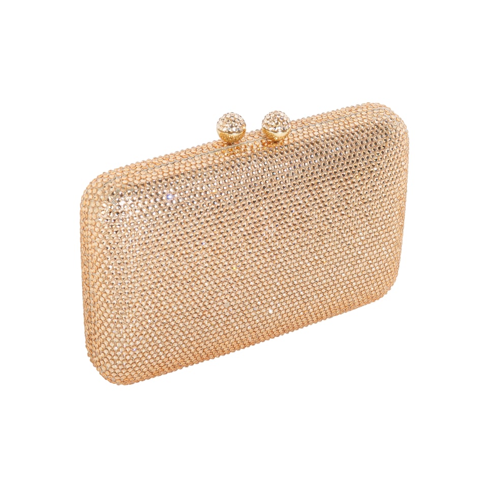 Clutch retangular com aplicação de strass na cor champanhe com fecho metal dourado com aplicação de strass na cor champanhe.