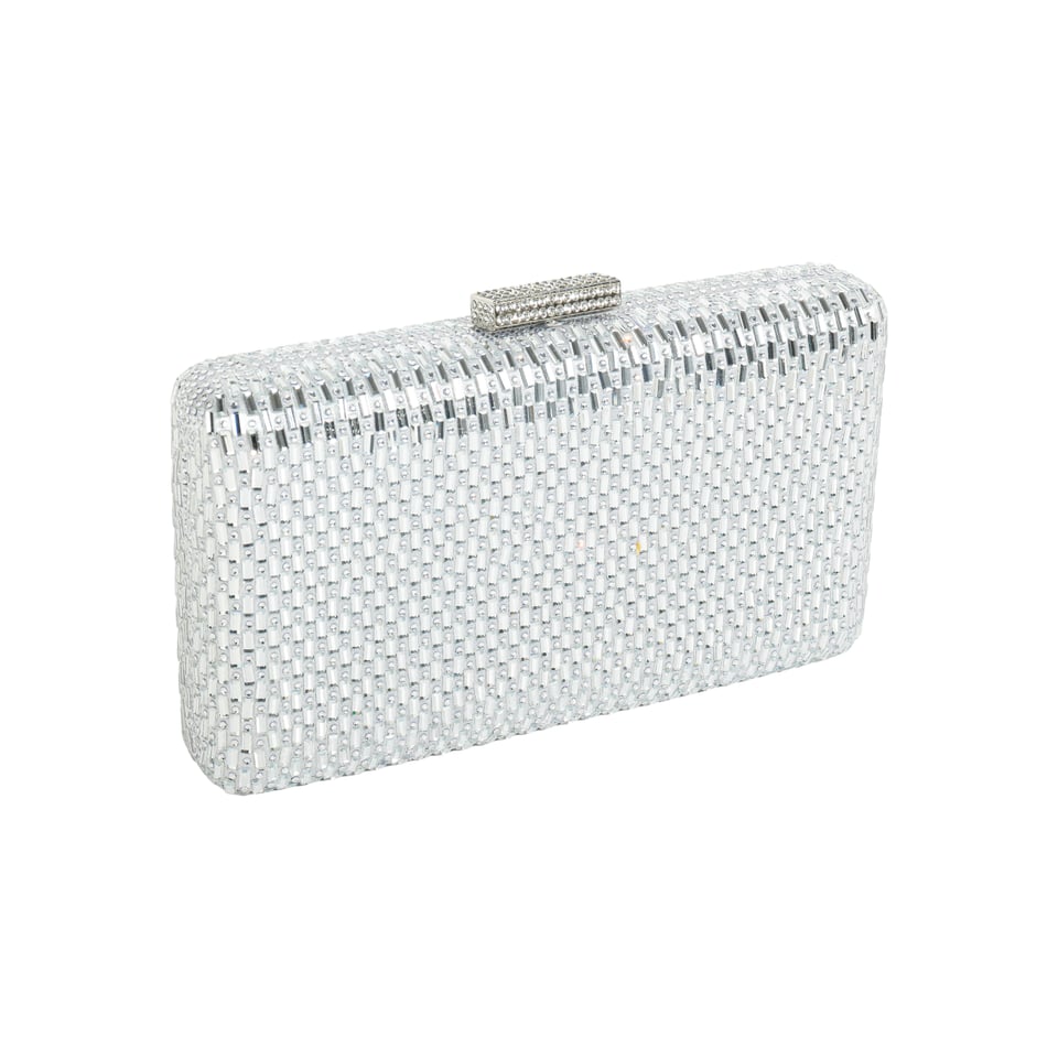 Clutch retangular com aolicação de cristais retangulares e redondos na cor prateado.