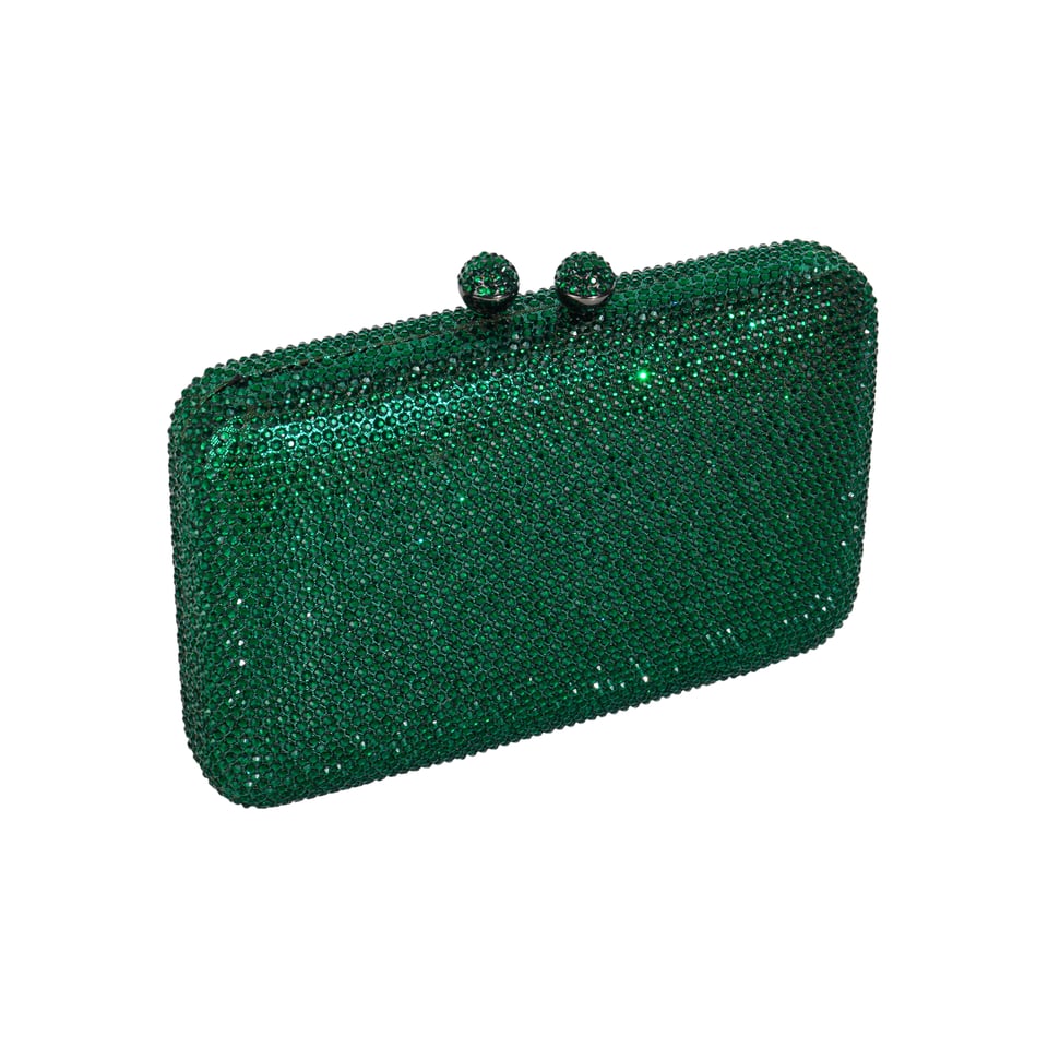 Clutch com aplicação de strass na cor verde musgo com fecho de metal na cor grafite com aplicação de strass na cor verde.