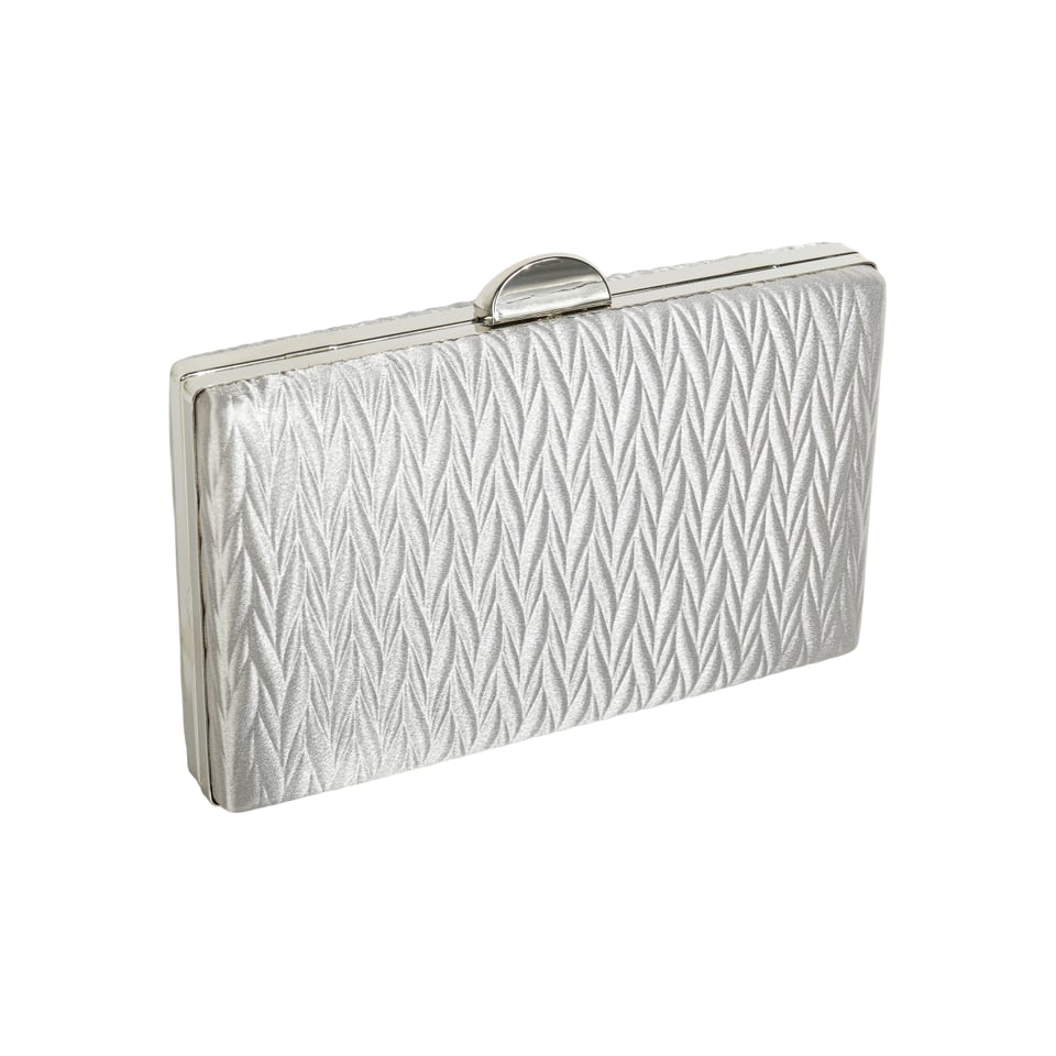 Clutch revestida em tecido na cor cinza lunar com acabamento no metal prateado.