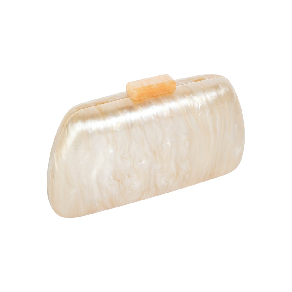 Clutch de acrílico imitando madrepérola na cor champanhe com fecho retangular de acrílico.