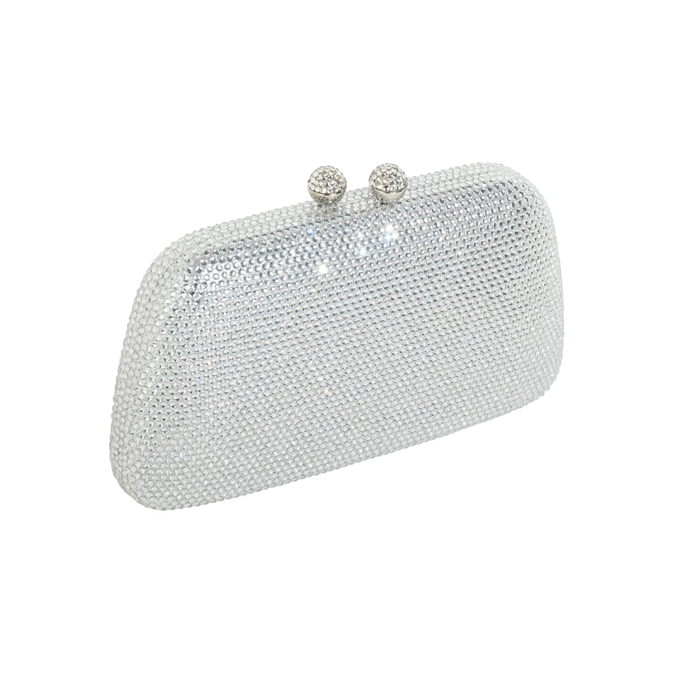 Clutch com design de trapézio com aplicação de strass na cor prateado e fecho de metal prateado com aplicação de strass na mesma cor.