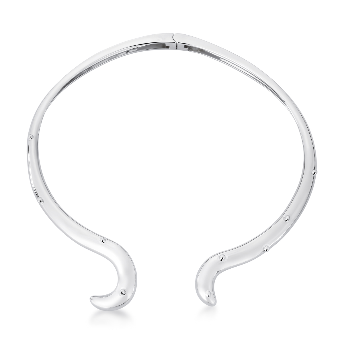 Colar aro curvo com abertura e mini esferas, uma semijoia moderna no banho de ródio que traz leveza e personalidade ao visual. Versátil e elegante, é aquela peça essencial que transita entre diferentes estilos, elevando desde produções casuais até composições mais sofisticadas.