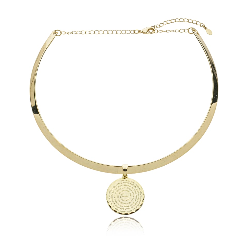 Colar aro banho de ouro com medalha redonda com oração Pai Nosso.