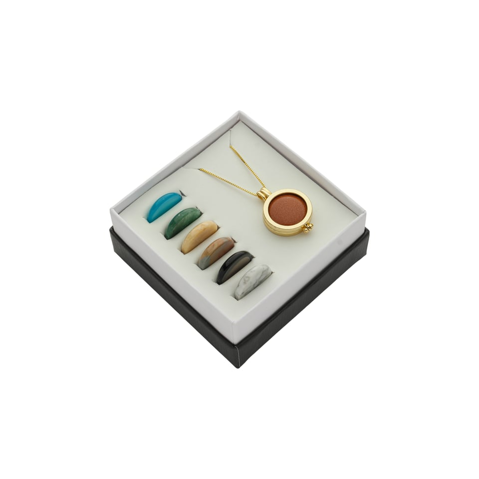 Colar curto banho de ouro com pingente cápsula e 7 pedras naturais variadas (ágata azul céu, quartzo verde, amazonita bege, pedra do sol, howlita branca, obsidiana fumê e ágata.)