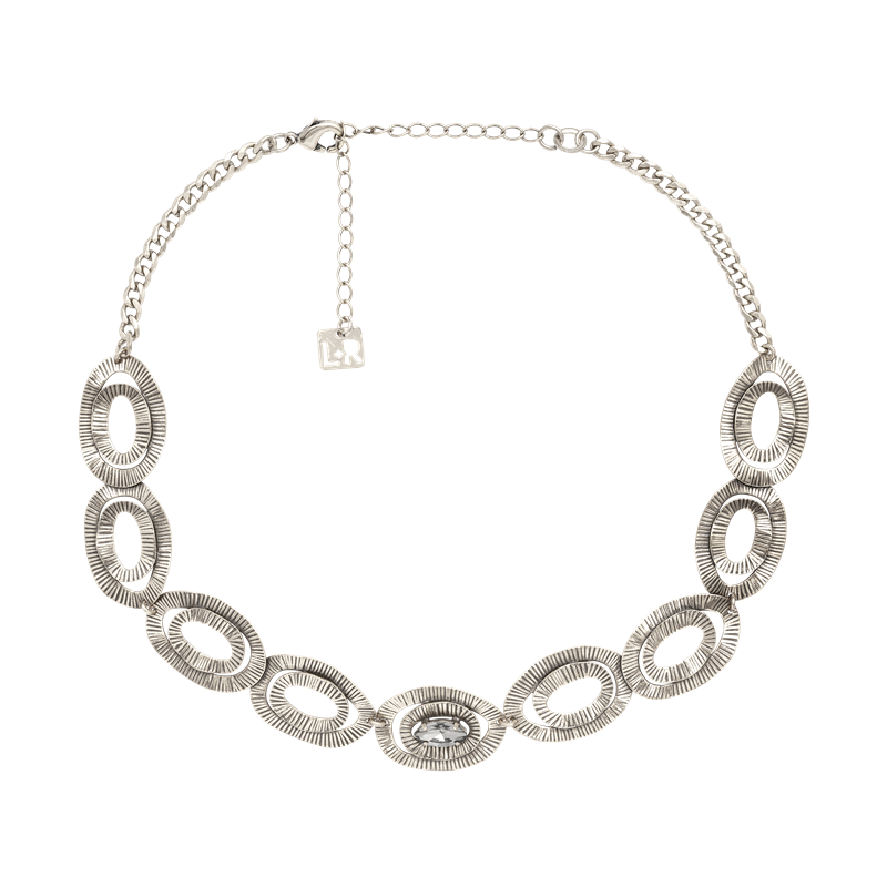 Colar choker Lita Raies com design entrelaçado em formas ovais texturizadas, uma semijoia elegante que une sofisticação e personalidade. Produzido com banho de prata vintage, apresenta acabamento rico em detalhes e aplicação de cristal na sofisticada cor Black Diamond, que adiciona brilho intenso e um toque moderno à peça. Níquel free, oferece mais conforto e reduz o risco de alergias. Seu design valoriza o colo com delicadeza e estilo, sendo perfeito para compor desde looks do dia a dia até produções mais elaboradas.