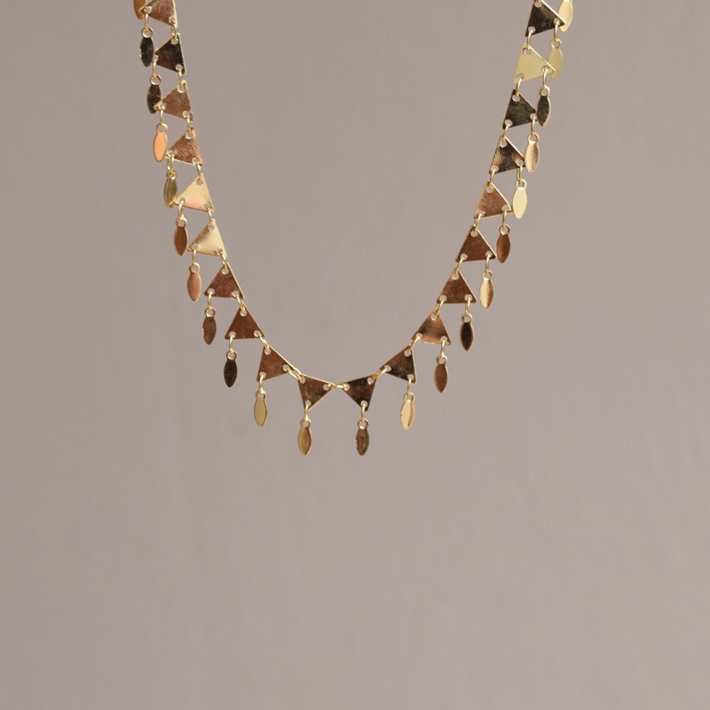 Colar choker banho de ouro toda de chapinhas triangulares com penduricalhos em formato navete.