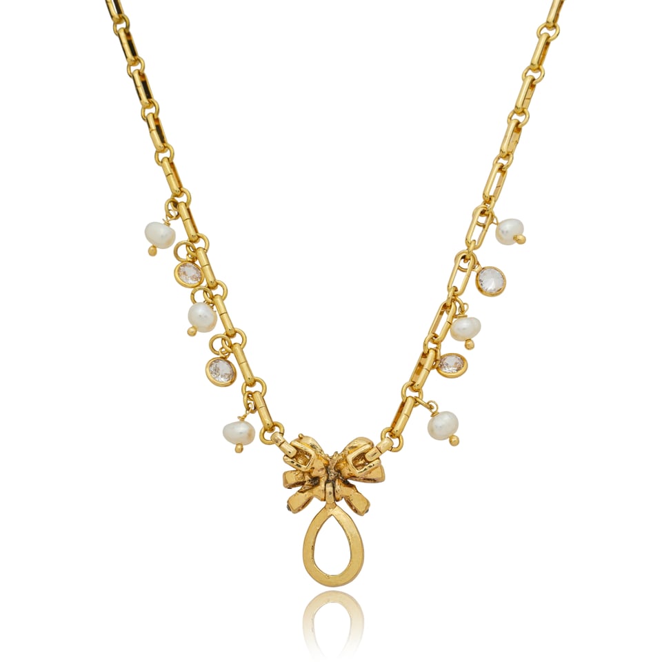 Colar curto banho de ouro vintage com design de laço com  cravação de micro cristais na cor branco (cristal) e aplicação de pérolas de água doce e cristais redondos.