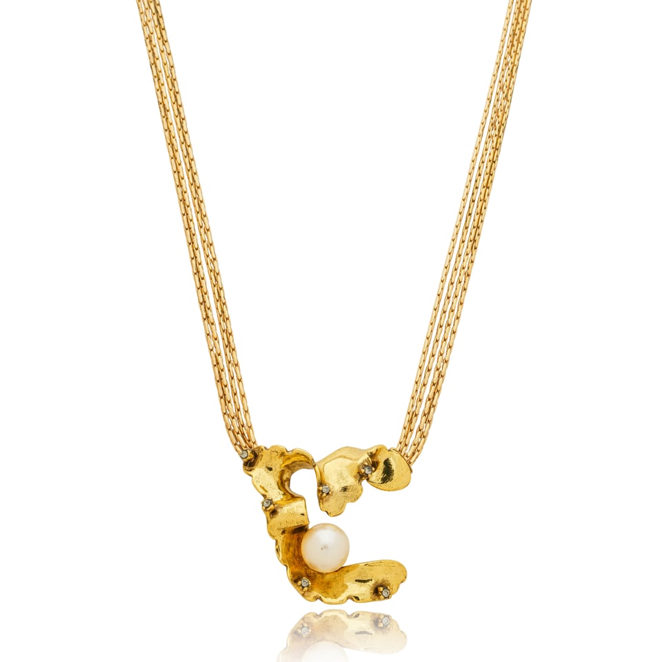 Colar curto banho de ouro vintage com 4 correntes e pingente orgânico fixo com aplicação de cristais e pérola.