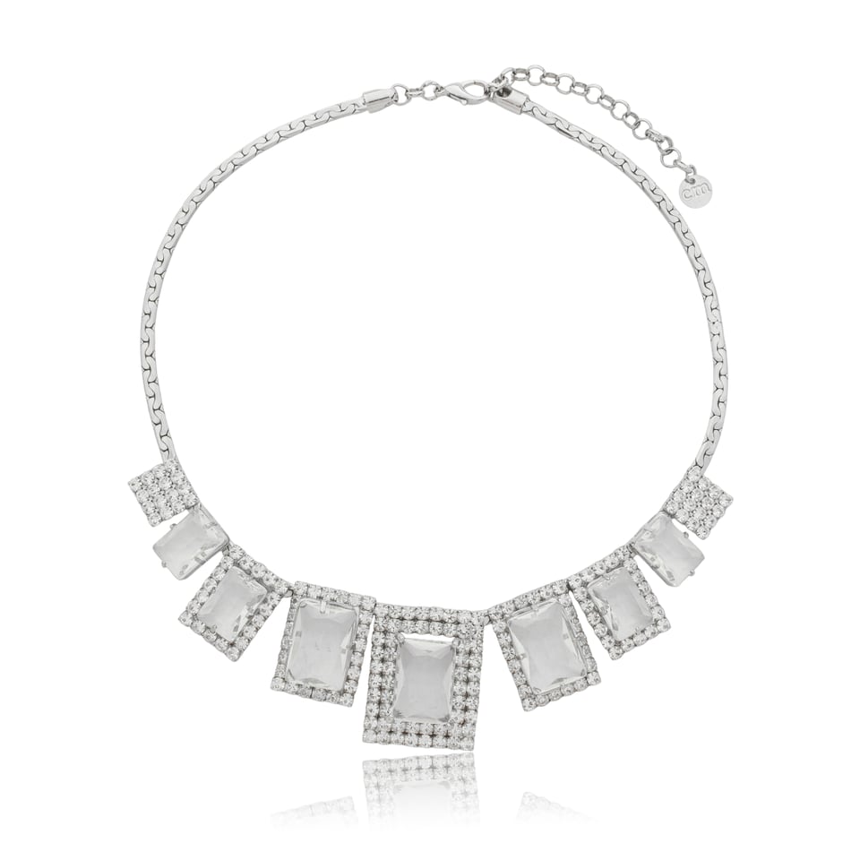 Colar banho prateado com placas retangulares com cravação de cristais na cor branco (cristal).