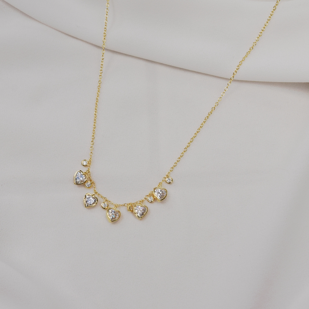 O Colar Corrente em Prata 925 com banho de ouro e penduricalhos de corações com moissanites 0,5 ct é a escolha perfeita para quem busca uma joia delicada, romântica e cheia de brilho. Seus pequenos corações cravejados criam um efeito encantador e feminino, trazendo leveza e movimento ao visual.
