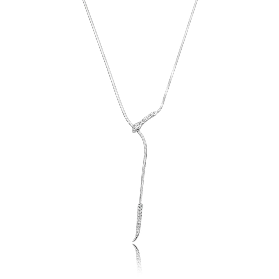 Colar corrente rabo de rato banho de ródio com a cabeça da serpente unida a uma parte da corrente formando a gravatinha com micro zircônias cravejadas na cor branco (cristal).
