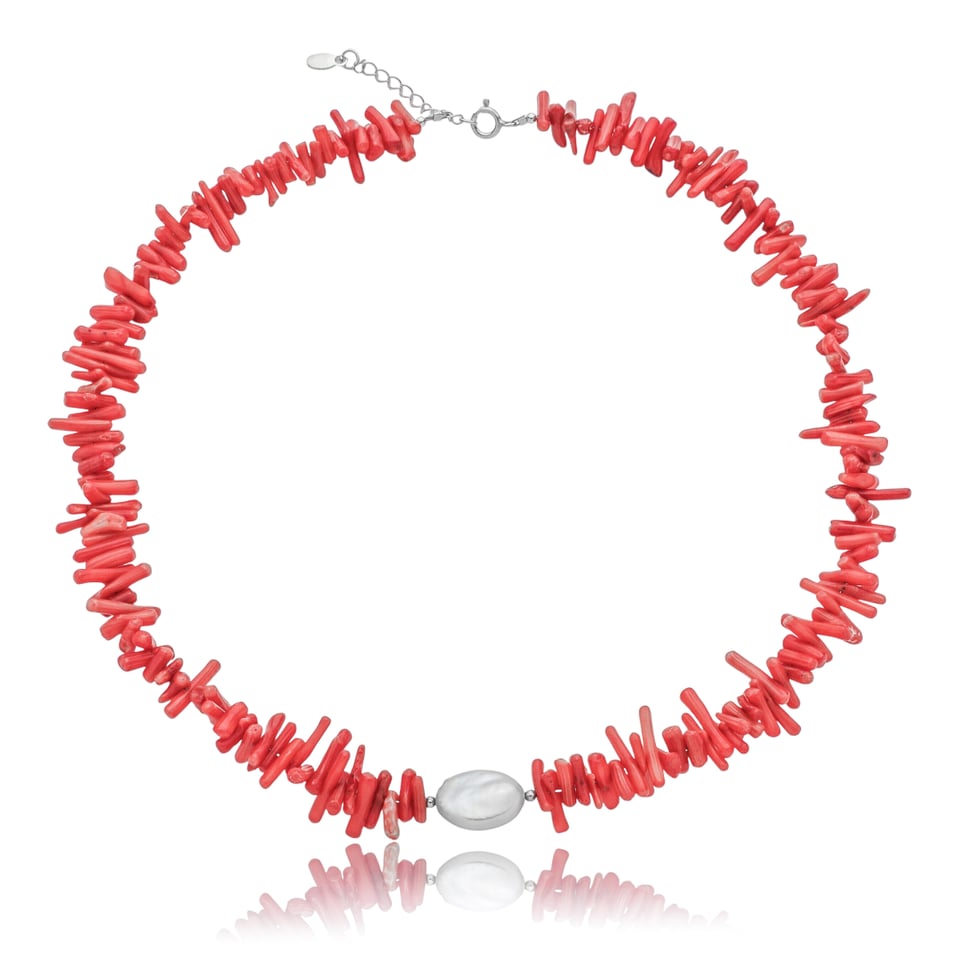 Colar curto com pedra coral natural reciclado e colorido ; e pérola barroca com acabamento em prata 925.