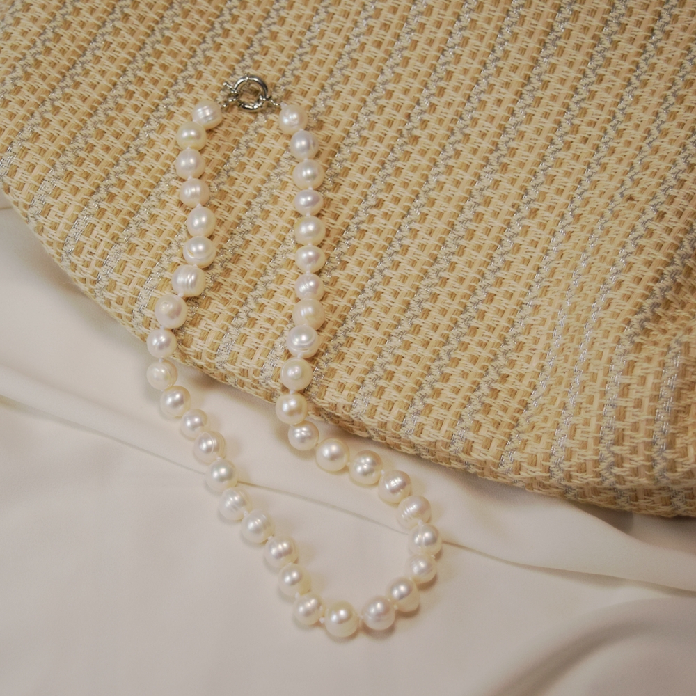 Seu design versátil com fecho bóia, permite que o colar seja usado tanto em produções clássicas quanto em combinações modernas, trazendo um toque de leveza e sofisticação ao visual. O brilho acetinado das pérolas destaca-se com delicadeza no colo, criando um efeito elegante e atemporal.