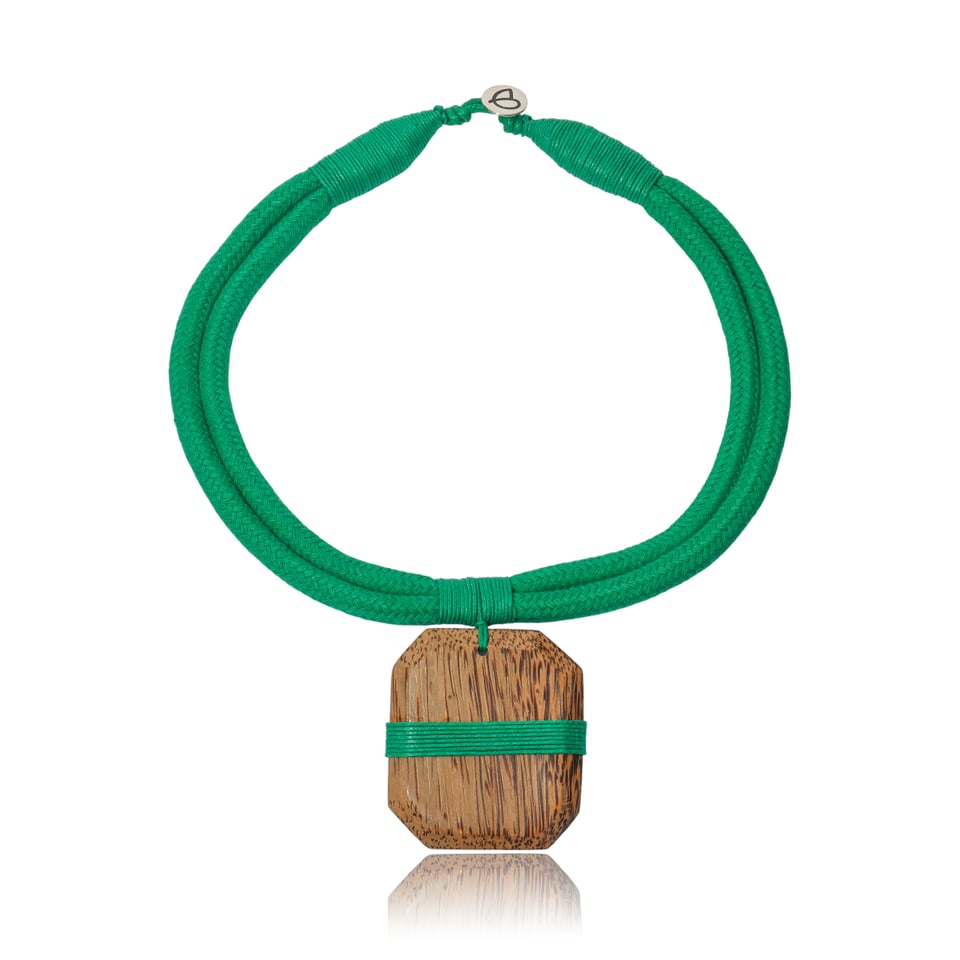 Colar produzido artesanalmente em fios 100% de algodão na cor verde com pingente de madeira..