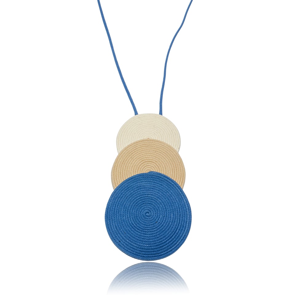 Colar longo produzido artesanalmente em fios 100% de algodão nas cores azul, bege e cru.