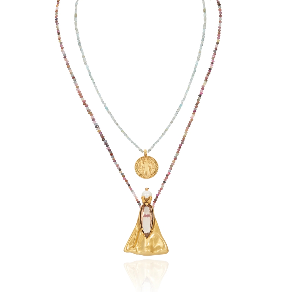 O Colar Duplo Nossa Senhora Aparecida da linha Religare Medalhas celebra fé e proteção em um design autoral. A peça combina medalhas delicadamente trabalhadas com pedra natural Aquamarine, cristais e metais com banho em ouro velho, criando um acessório sofisticado que traduz espiritualidade e elegância no dia a dia.