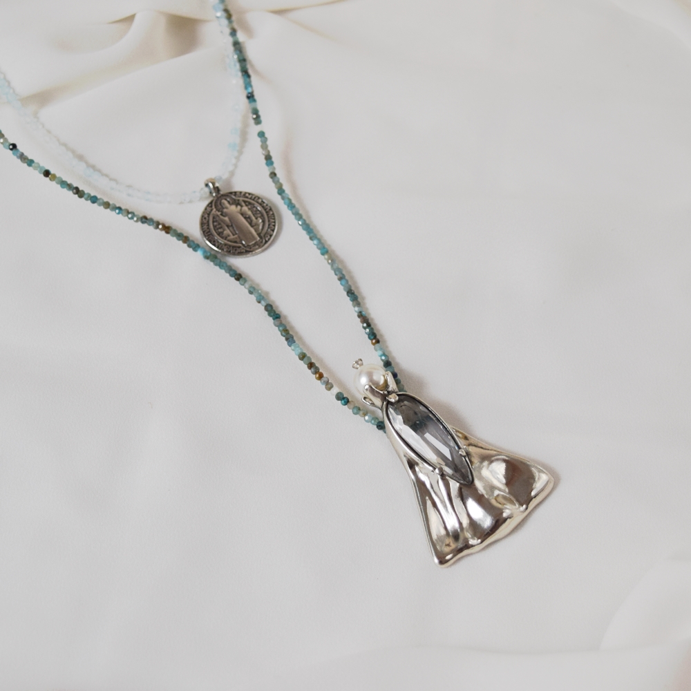O Colar Duplo Nossa Senhora Aparecida da linha Religare Medalhas celebra fé e proteção em um design autoral. A peça combina medalhas delicadamente trabalhadas com pedra natural Aquamarine, cristais e metais com banho em prata velho, criando um acessório sofisticado que traduz espiritualidade e elegância no dia a dia.