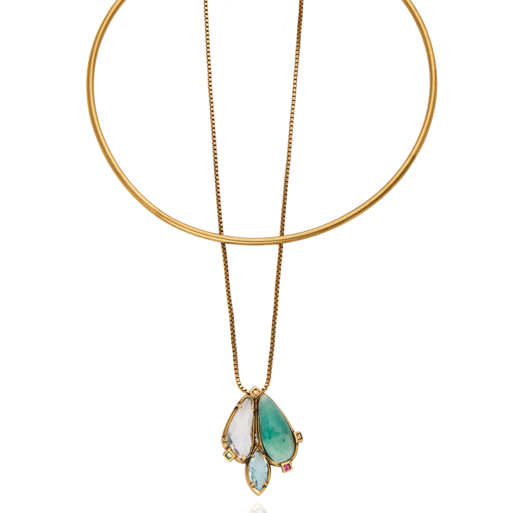 Com aro rígido em banho ouro velho e pingentes de cristais e quartzo verde, o colar destaca tons que remetem ao azul mediterrâneo e à luminosidade das paisagens costeiras. As pedras naturais, únicas em cor e transparência, reforçam o espírito livre e o luxo descontraído da coleção.