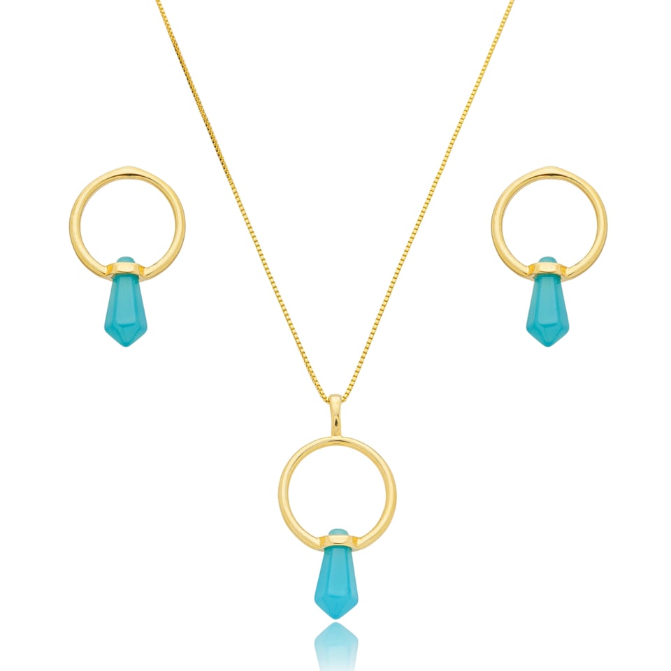 Colar e brinco banho de ouro com pedra natural ágata azul céu.