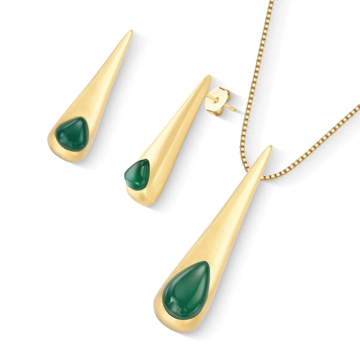 Conjunto de colar e brinco com design em gota alongada, confeccionado com pedra natural ágata verde e acabamento em banho de ouro acetinado. As peças apresentam linhas suaves e elegantes, com proporções alongadas que valorizam o colo e o rosto, trazendo leveza e sofisticação ao visual. A ágata verde, conhecida por simbolizar equilíbrio, harmonia e renovação, adiciona um toque de naturalidade e significado à semijoia. Versátil e atemporal, o conjunto transita com facilidade entre produções do dia a dia e looks para ocasiões especiais, oferecendo brilho equilibrado, acabamento refinado e um estilo elegante com personalidade.
