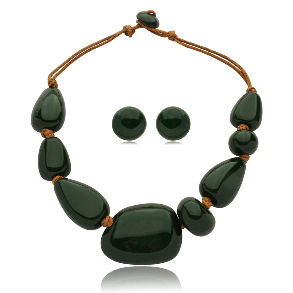 Colar curto cordão couro na cor caramelo com placas de resina na cor verde escuro.