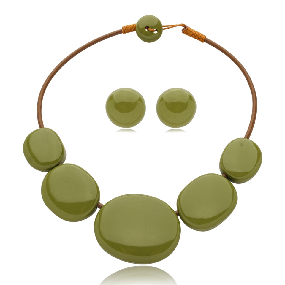 Colar curto cordão couro na cor caramelo com placas de resina na cor verde oliva.