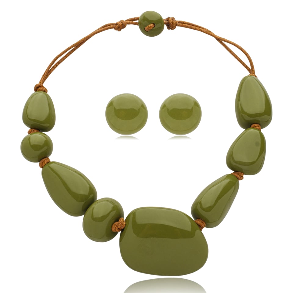 Colar e brinco Marcia Pouso resina verde oliva