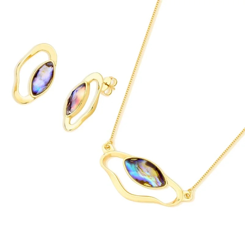 Dimensões: Corrente com 40 cm de comprimento mais 7,5 cm de corrente extensora; pingente: 1,8 cm de altura por 3,9 cm de largura; brinco: 2,7 cm de altura por 1,8 cm de largura.