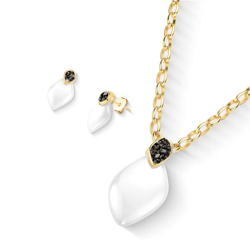 Conjunto composto por colar e brinco banhados a ouro, elaborado para destacar a beleza das formas orgânicas e das pedras naturais. Cada elemento foi cuidadosamente selecionado para criar uma peça que combina textura, luminosidade e sofisticação em perfeita harmonia.