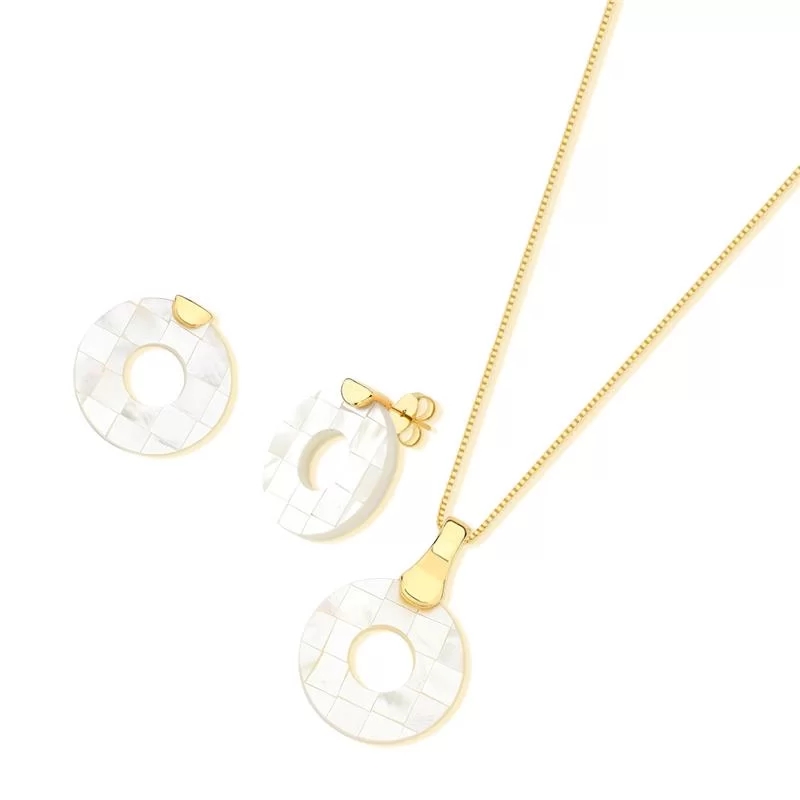 Colar e brinco banho de ouro com mosaico de madrepérola vazado.